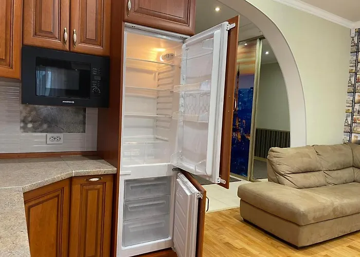 Iris apartment is situated in the Shevchenkivskyj district, 0.5 km from Igor Sikorsky Kyiv International airport. Among the other facilities are a microwave oven, an electric kettle and a refrigerator, provided for self-catering.