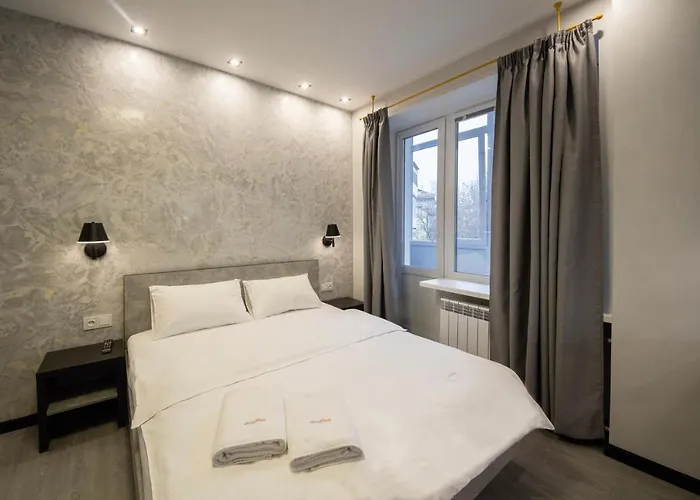 Situado a unos 25 minutos andando de la Puerta dorada de Kiev, este hotel también está no demasiado lejos de la estación de tren Kiev. El Apartments se ubica a 25 minutos andando del centro de Kiev. Se encuentra a 25 minutos caminando de la Sinagoga Brodsky.